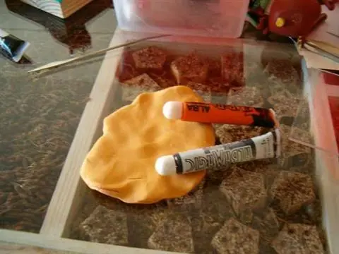 Deberás mezclar otro poco de porcelana fría, en este caso un trozo de mayor tamaño, con témpera anaranjada y un poquito de negro. Amásala bien para que quede maleable.