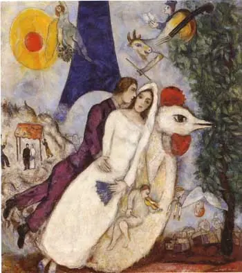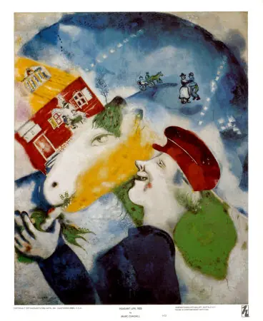 Tras un breve aprendizaje con el maestro Jehuda Pen y una estancia en San Petersburgo en la escuela Svantseva, Chagall recibe una bolsa de estudios del mecenas Vinaver que le ofrece la posibilidad de viajar a París. Corre el año 1910. A su llegada a esta ciudad le impresiona todo, la luz, el color, el aire que respira y sobre todo la libertad. En su vocabulario aparecen dos nuevos términos lumière-libertè y couleur-amour, la unión de ambos constituye la estructura básica de su pintura.