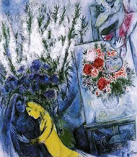 El reencuentro con la patria le llena de vigor, de fuerza, de energía y de amor. En 1915 se casa con Bella Rosenfeld y de esa unión nace una niña, Ida. Es esta la época en la que Bella y Chagall volarán por los tejados, sobre la ciudad, y harán de su amor uno de los motivos principales de su obra. De este periodo son cuadros como El cumpleaños, El paseo, o Sobre la ciudad. Volar, el amor y la música constituyen los motivos principales de la obra chagalliana: los tres guardan una relación muy estrecha, los tres hacen salir al individuo de su estado normal. Pero no todo es amor, también hay guerra, a la que sucederá una revolución, la de 1917.