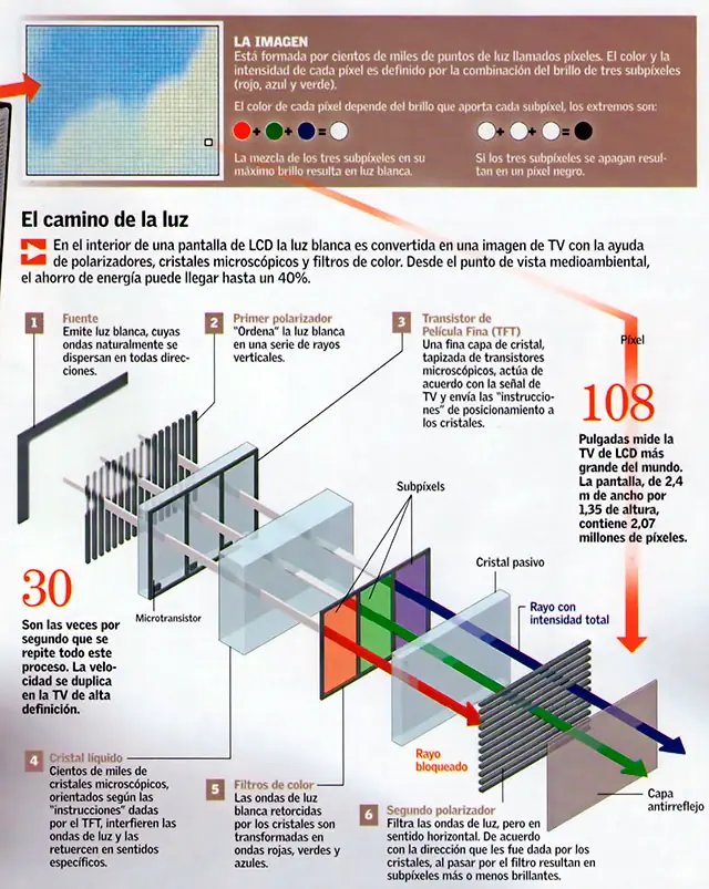 La misma tecnología que se utiliza en las pequeñas pantallas de los celulares y las laptop, basada en el uso de cristal líquido, llegó a los aparatos de TV y se produjo una revolución en cuanto al tamaño y la calidad de la imagen. Los nuevos televisores de LCD, además, son más chatos y livianos que los convencionales, y más eficientes y económicos en cuanto al consumo de energía eléctrica.