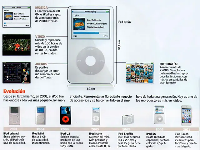 Desde su lanzamiento, en 2001, el iPod fue haciéndose cada vez más pequeño, liviano y eficiente. Representa un floreciente negocio de accesorios y se ha convertido en el símbolo de toda una generación. Hoy es uno de los reproductores más vendidos.