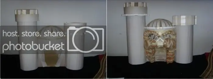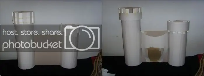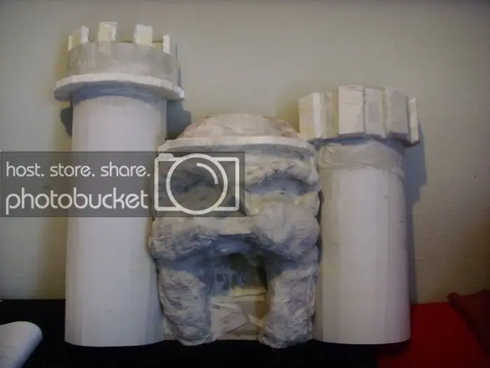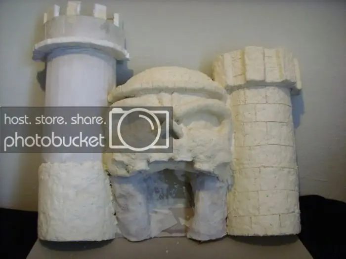 En el extremo de las torres coloqué tiras de telgopor y luego con cartón recubrí una de ellas por completo y la otra por la mitad. A no preocuparse por la prolijidad ya que todo quedará recubierto con papel maché.
