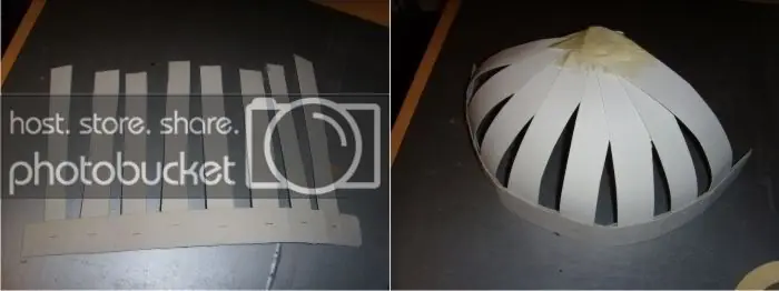 Para la cúpula, y como se verá solo una parte de ésta, se me ocurrió hacer una especie de “peine” en cartón, con pegamento y una abrochadora (engrampadora) y cinta adhesiva para aligerar el proceso.