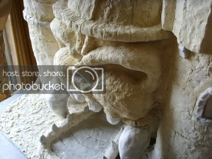 Y una vez seco (a las 24hs seca el papel maché y endurece considerablemente) armé los colmillos y los detalles de la entrada también con papel maché mas espeso y compactado.