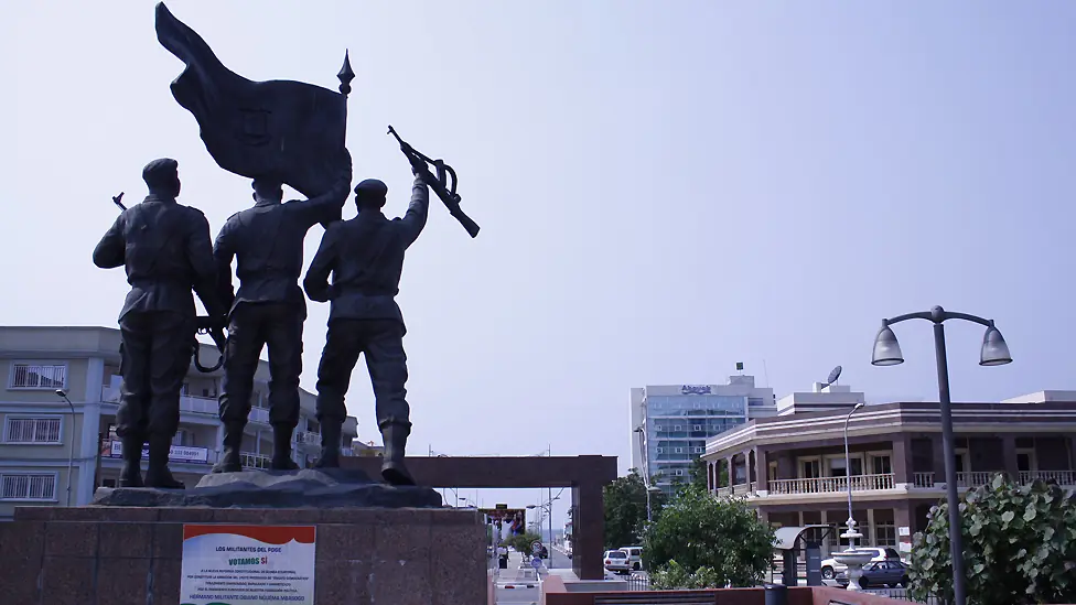 Obiang tomó el poder en 1979 cuando derrocó, en un golpe de estado, a su tío Francisco Macías Nguema. Macías había llegado a la presidencia democráticamente, tras la independencia, pero durante su mandato miles de personas tuvieron que exiliarse y muchas otras fueron asesinadas. Este monumento en Bata conmemora el golpe.