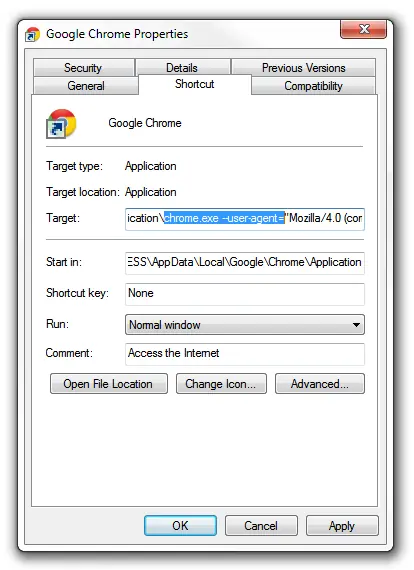C: Users tu nombre de usuario, AppData Local Google Chrome Application chrome.exe - user-agent = "Mozilla/4.0 (compatible; MSIE 7.0, Windows NT 6.0)"