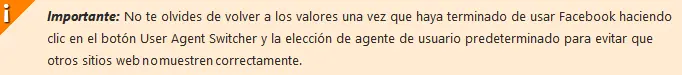 Antes de continuar, me gustaría que se específica que esto es sólo una solución temporal, que no tengo idea de cuánto tiempo va a funcionar. No son en realidad desactivar la Biografia (timeLine), usted está diciendo a Facebook que su navegador es una versión anterior que no se admite la función de línea de tiempo, y de esta manera Facebook responde con una versión compatible de la página.