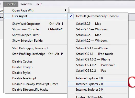 3. Ir al Desarrollo, navegar agente de usuario y seleccione Internet Explorer 7.