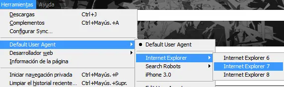 5. Ahora, haz clic en el botón User Agent Switcher y navegar a través de Internet Explorer y seleccione Internet Explorer 7.