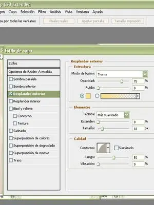 y a esta misma capa le aplicamos resplandor exterior con el color # fbdf89 y los siguientes valores: