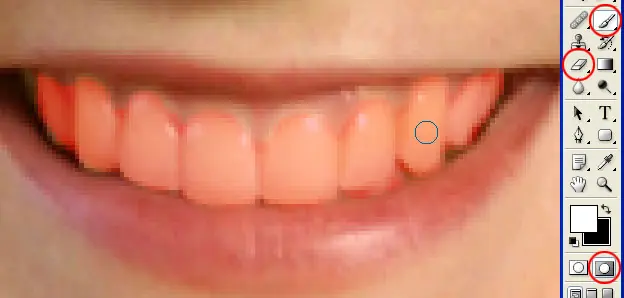 Aquí entramos en Modo Máscara Rápida (Quick Mask Mode), lo cual se logra presionando la letra "Q" y usando el pincel marca la zona de los dientes. Puedes usar el borrador si en alguna erraste el marcado. Una vez terminado deberá quedarte algo como vemos en la imagen.