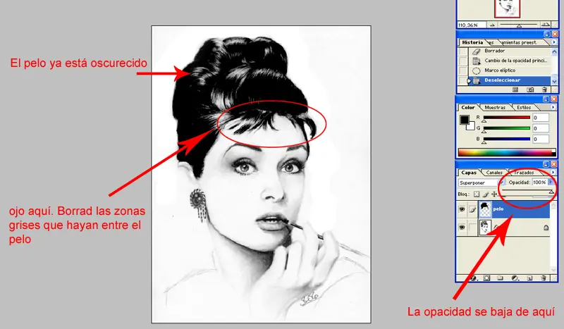 Cogemos un pincel más o menos grande, duro y pintamos el pelo de color negro. Vereis cómo el negro se hace más intenso. También podeis probar a poner en modo luz suave o cualquier otra que os guste. Probad, es la mejor forma de aprender. Si no os gusta tan oscuro podeis bajarle la opacidad a la capa.