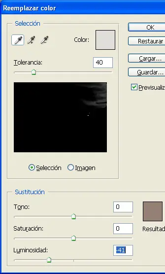 7º Sobre la marca de la imagen indicada, vamos a imagen>ajustes>reemplazar color y con el cuenta gotas seleccionamos ese pequeño blanco con los parámetro siguientes.