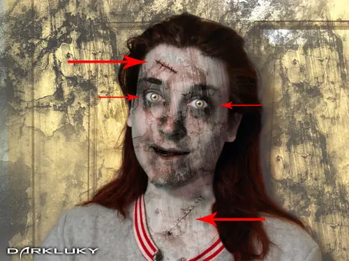 7.- Cogemos la herramienta Subexponer y con un pincel blando vamos haciendo algunas zonas más oscuras, por ejemplo los párpados y las pestañas, la mano... en la imagen os señalo más o menos lo que yo oscurecí: