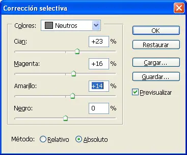 3º Imagen>ajustes>corrección selectiva. Con los siguientes parámetros.