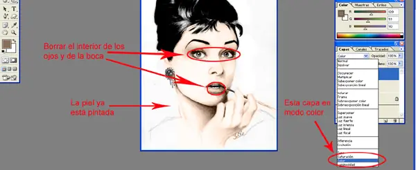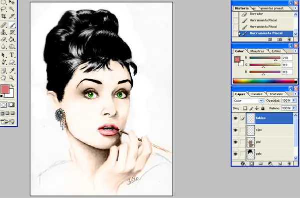 5.- Y por último pintamos los labios. Volvemos a crear capa nueva, la ponemos en modo color y le ponemos de nombre labios . Cogemos otra vez un pincel duro y ponemos de color frontal el que queramos para los labios, en mi caso le puse el color DA7171. Como hemos hecho todo el rato borramos donde nos hayamos salido. Pintad también un poco la punta del pincel con el que se está pintando los labios para que las zonas claras queden del mismo color que los labios.