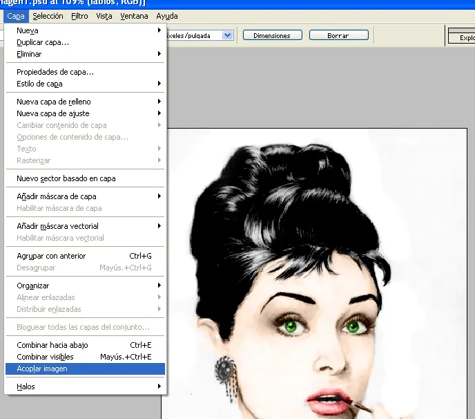 6.- Ya hemos terminado de pintar. Ahora lo unimos todo: capa/acoplar imagen.