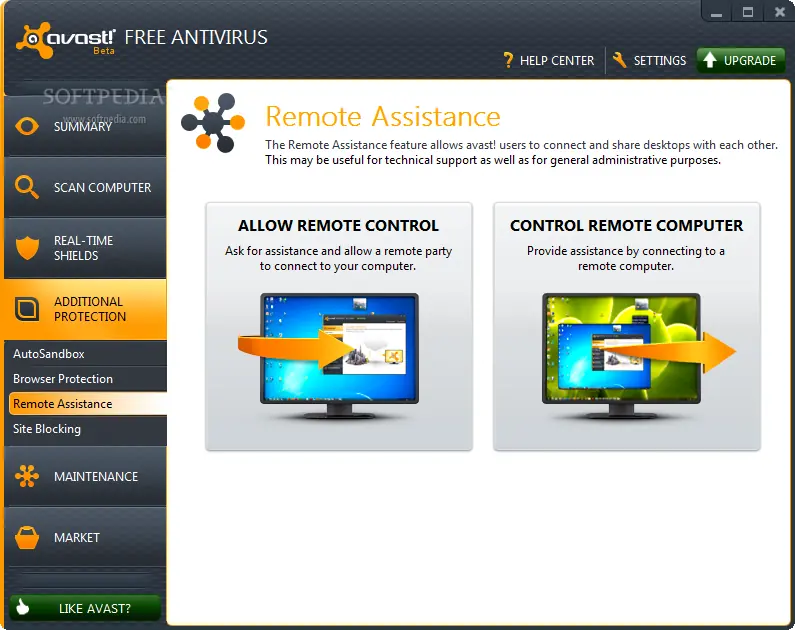 La asistencia remota también es nueva en la lista de funciones. Te permitirá conectarte remotamente a otros ordenadores que tengan avast! 7 y compartir escritorios con cada uno. El propósito principal de esta función es el de ayudar a los amigos con problemas de ordenador.