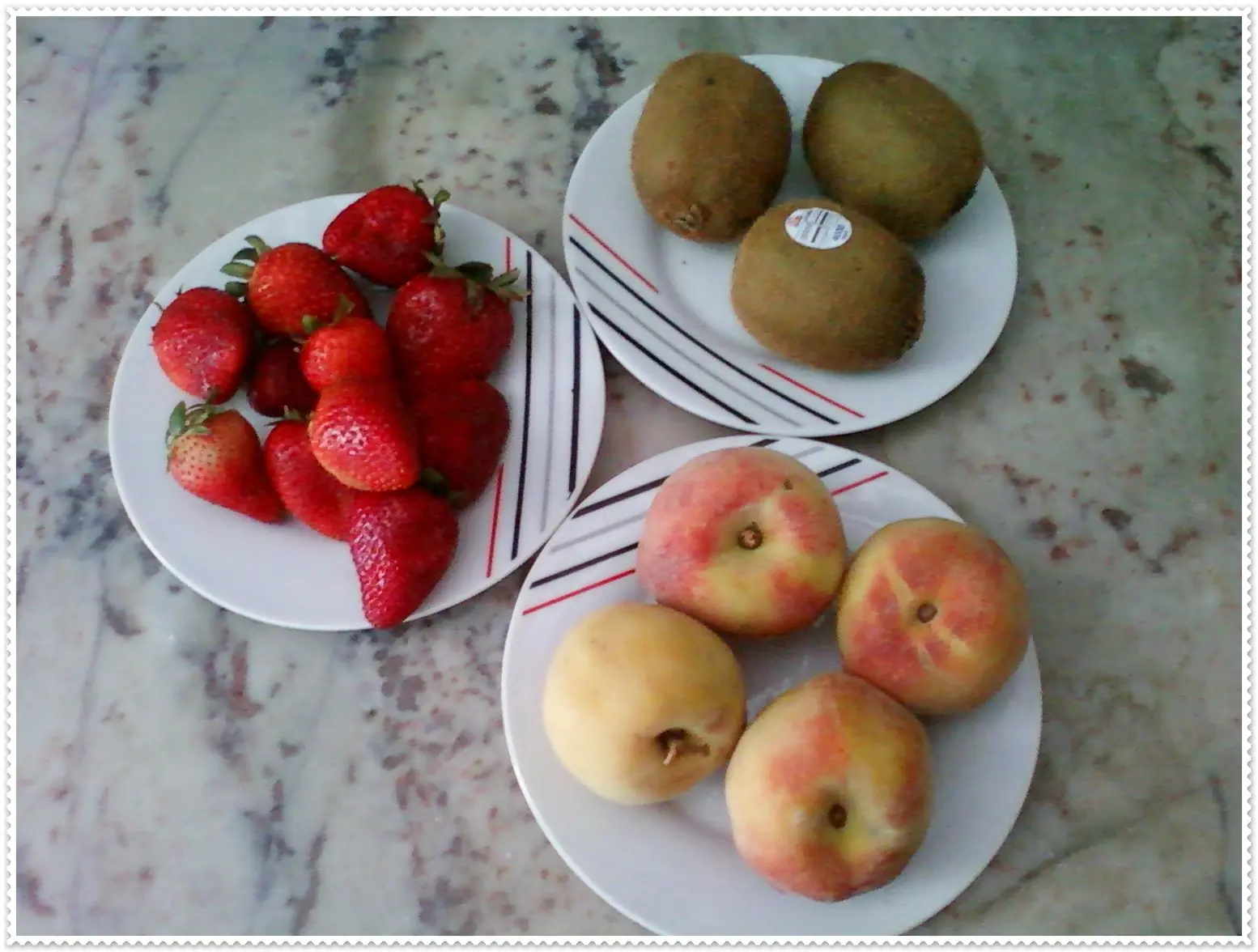 Pelar los duraznos y kiwis , cortar en gajos finos., Lavar las frutillas partir por la mitad , guardar una entera para el centro. Decorar a gusto combinando los colores.