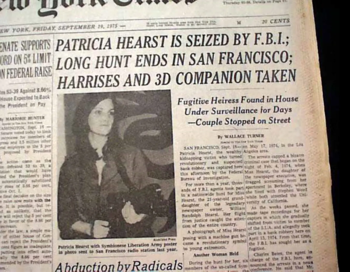 La vida de guerrillera de Patricia Hearst terminó 18 meses después de su secuestro, cuando el 18 de septiembre de 1975 fue detenida por agentes del FBI en San Francisco.