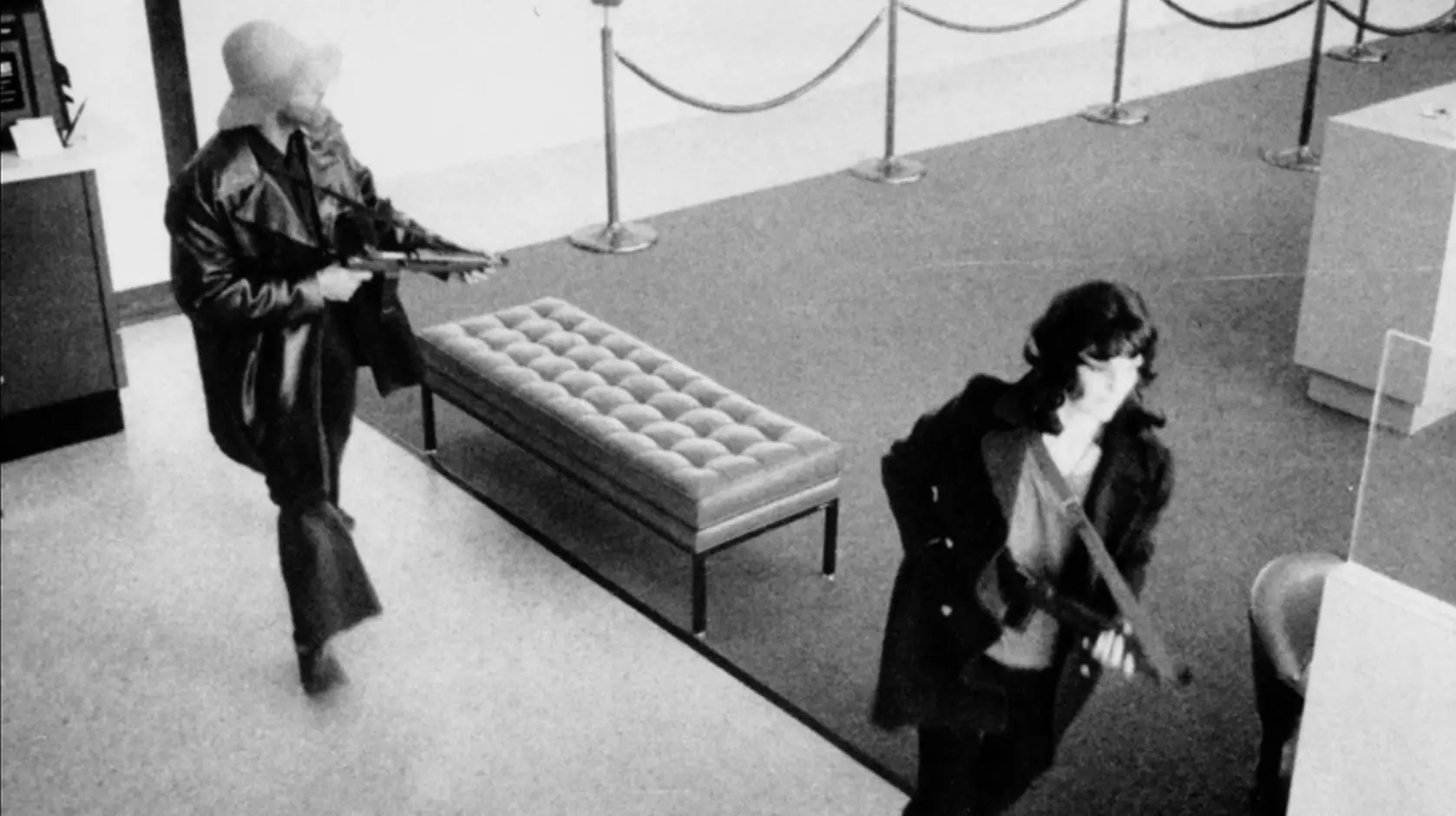 Patricia Hearst es vista en las imagenes de las camaras de seguridad en el asalto al banco Hibernia.