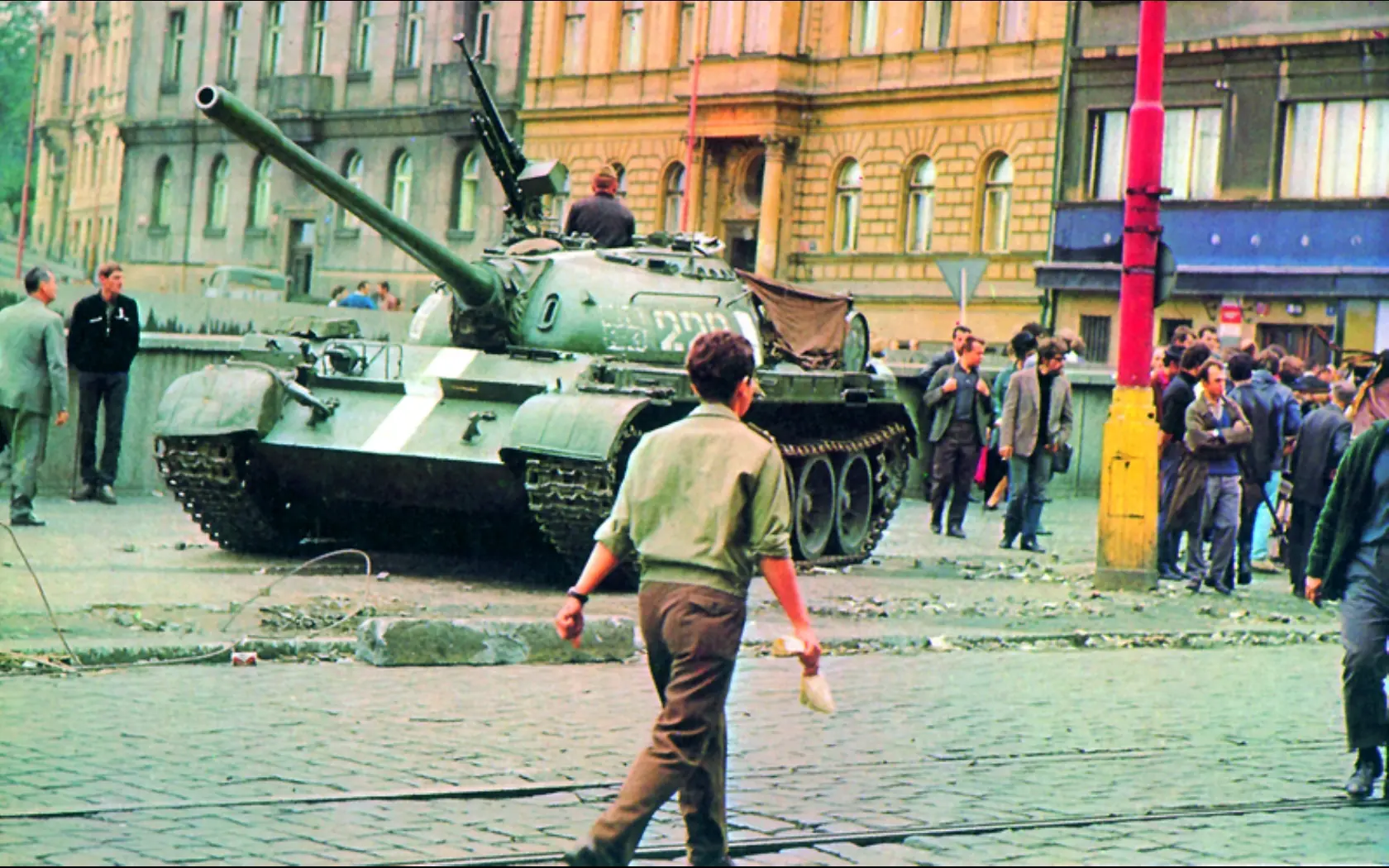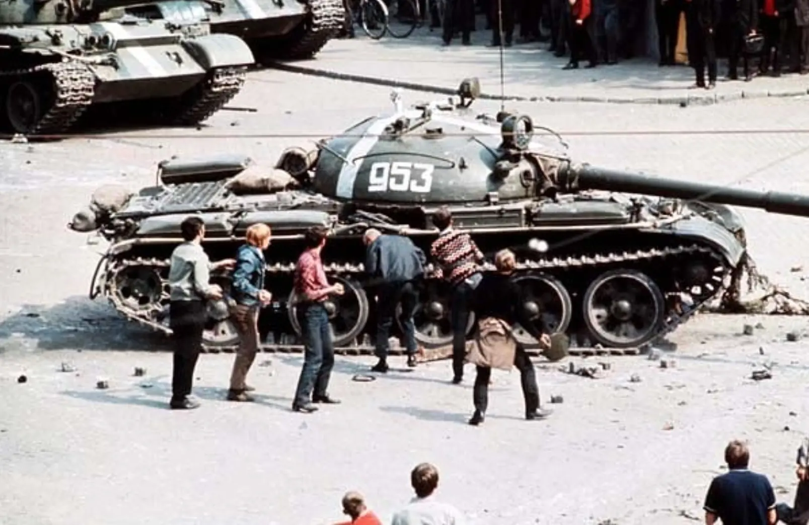 Manifestantes arrojando piedras a los tanques del Pacto de Varsovia .