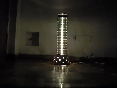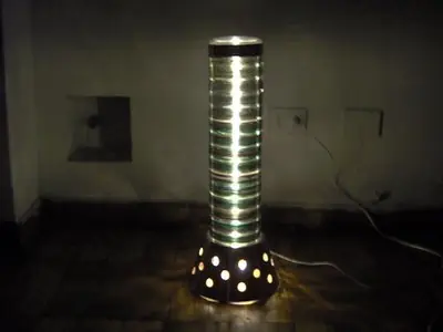 2. El cuerpo de la lámpara es una columna de discos CD y DVD, los que fueron fijados entre si con dos barras de acero.