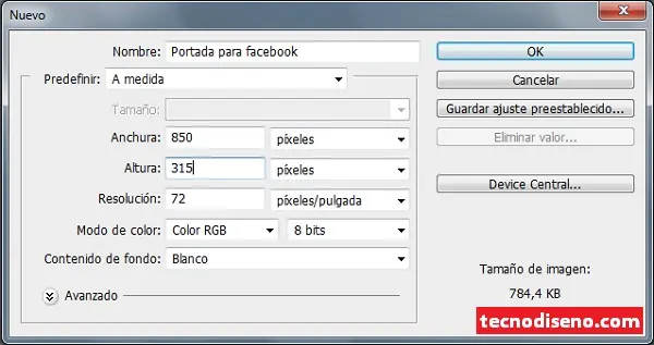 1. Abrimos photoshop y creamos un nuevo documento (CTRL + N) con las medidas 850px ancho por 315px alto