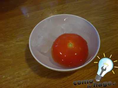 Ponemos el tomate en el recipiente y rellenamos con agua caliente. Dejamos reposar el tomate de unos 20 a 30 segundos.