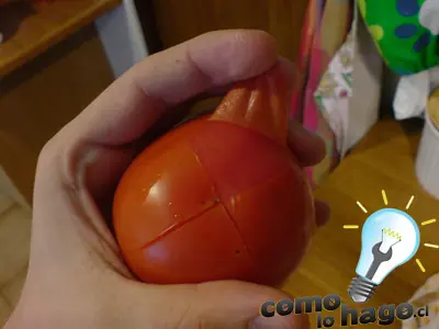 A continuación tomamos el tomate por su cara inferior y lo pelamos tomando la piel desde una de las 4 puntas que se formaron de los cortes que hicimos.