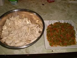 Desmenuzar el pollo, cortarlo en cubos, como más te guste. NOTA MB: El SECRETO para que la tarta quede compacta y no se desarme toda al cortar es que toda la mezcla debe estar FRIA o a temperatura ambiente, importantísimo, no salido recién del fuego.