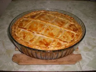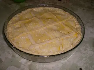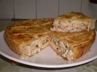 En una tartera colocás la masa (pinchala con un tenedor para evitar que se levante durante la cocción). Agregás la preparación, ponés la otra tapa encima. Pincelás con una yema para darle color y después de la yema, volvés a pinchar con un tenedor. NOTA MB: lo pinchás después de la yema, porque si lo hacés antes, después al pincelar, se vuelven a cerrar los agujeritos y se convierte en un globo dentro del horno.