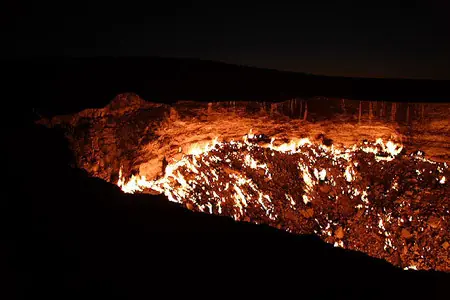 En pleno desierto de Karakum (Turkmenistán), cerca de la pequeña aldea de Darvaza, se encuentra un cráter de unos cincuenta metros de diámetro y más de veinte de profundidad, bautizado por los lugareños como “La Puerta del Infierno”. En el interior del pozo, un fuego abrasador arde desde hace décadas, en un incendio que parece no tener fin. Esto es una vieja explotación minera que topó con un yacimiento de gas, y desde entonces, aquello ilumina las frías noches del desierto.