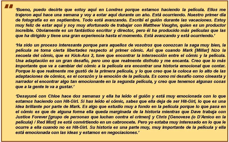 En relación a la película, comenta que se encuentra en pre-producción, esperando que la fotografía se inicie en Septiembre. También nos habla de lo que veremos en la secuela y responde a los que dicen que Chloë Moretz puede ser demasiado mayor para encarnar a Hit-Girl: