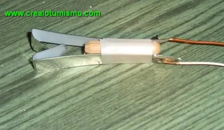 Poner los extremos doblados como aparece en la foto (tocándose) y entre los dos trozos pondremos un taco de madera. Luego lo envolvemos con un poco de cinta aislante.
