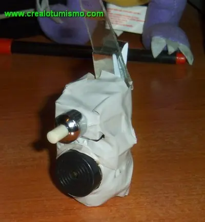 Con un poco de cinta aislante lo afirmamos y le colocamos un trozo de plástico (en este caso se utilizó un pedazo de CD).