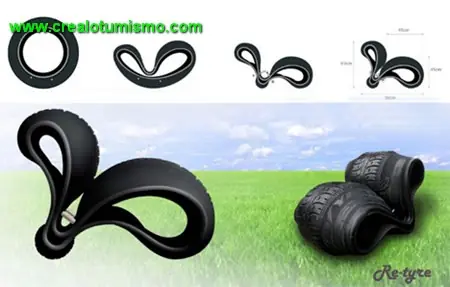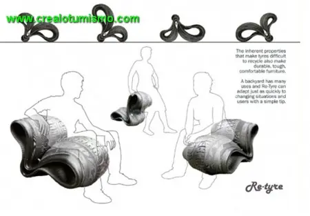 No sé que tan cómodo será sentarse en este sillón, pero es muy original ver cómo podemos reutilizar materiales viejos. La idea básicamente es hacerle cuatro orificios al neumático, doblarlo y pasarle unas barras por los huecos para darle la forma de “sillón”.