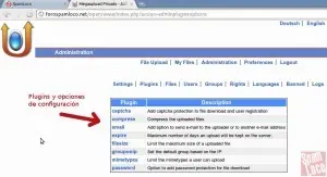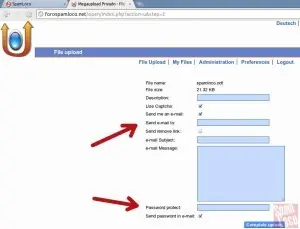 En la captura anterior se puede ver la sección para subir archivos, en la siguiente algunas opciones extras para agregarle una descripción, captchas al descargarlo, envío por e-mail de los enlaces de descarga y eliminación, incluso se le puede configurar un password:
