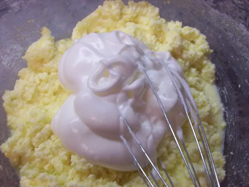 Colocar la mitad de las claras batidas a nieve en el batido de la ricota y revolver, luego agregar la otra mitad y esta vez revolver con movimientos envolventes