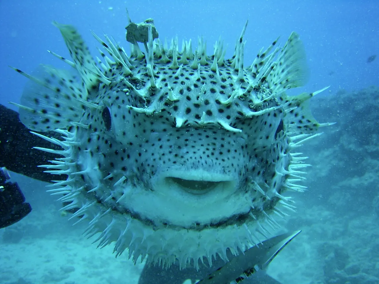 Sí, y de hecho esta estrategia de defensa es un tanto completa. Este extraño animal, al sentirse atrapado o amenazado reacciona inmediatamente tragando agua con lo que aumenta su volumen considerablemente hasta convertirse en una pelota.