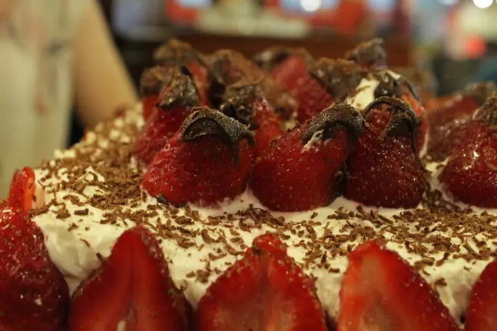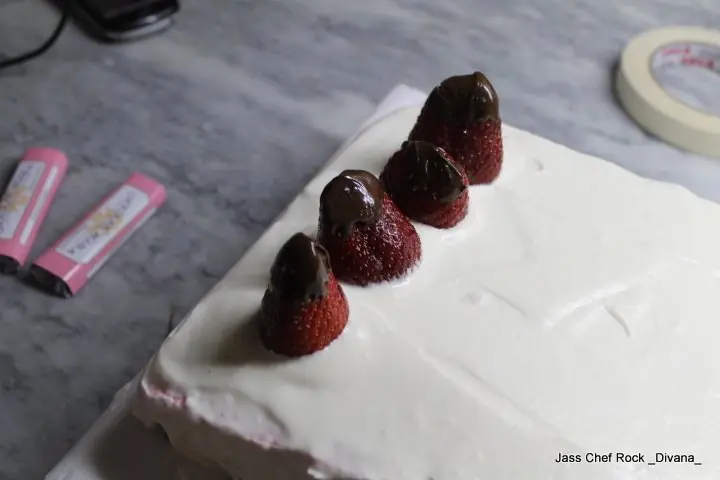 Vamos a untar la base de las frutillas en el chocolate y las vamos a ir colocando encima de la torta