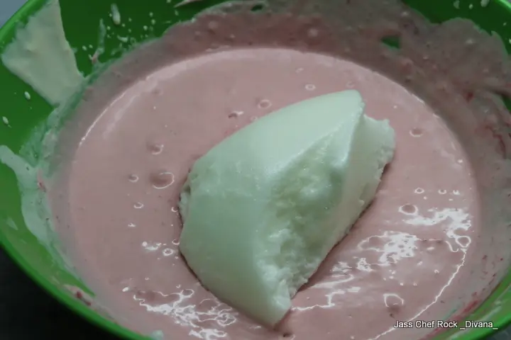 Sobre la crema de leche batida a medio punto vamos a agregar el queso crema, la gelatina sin sabor y la pulpa de frutillas. Podés agregarle tambien pedacitos chiquitos de frutillas para que quede más rico