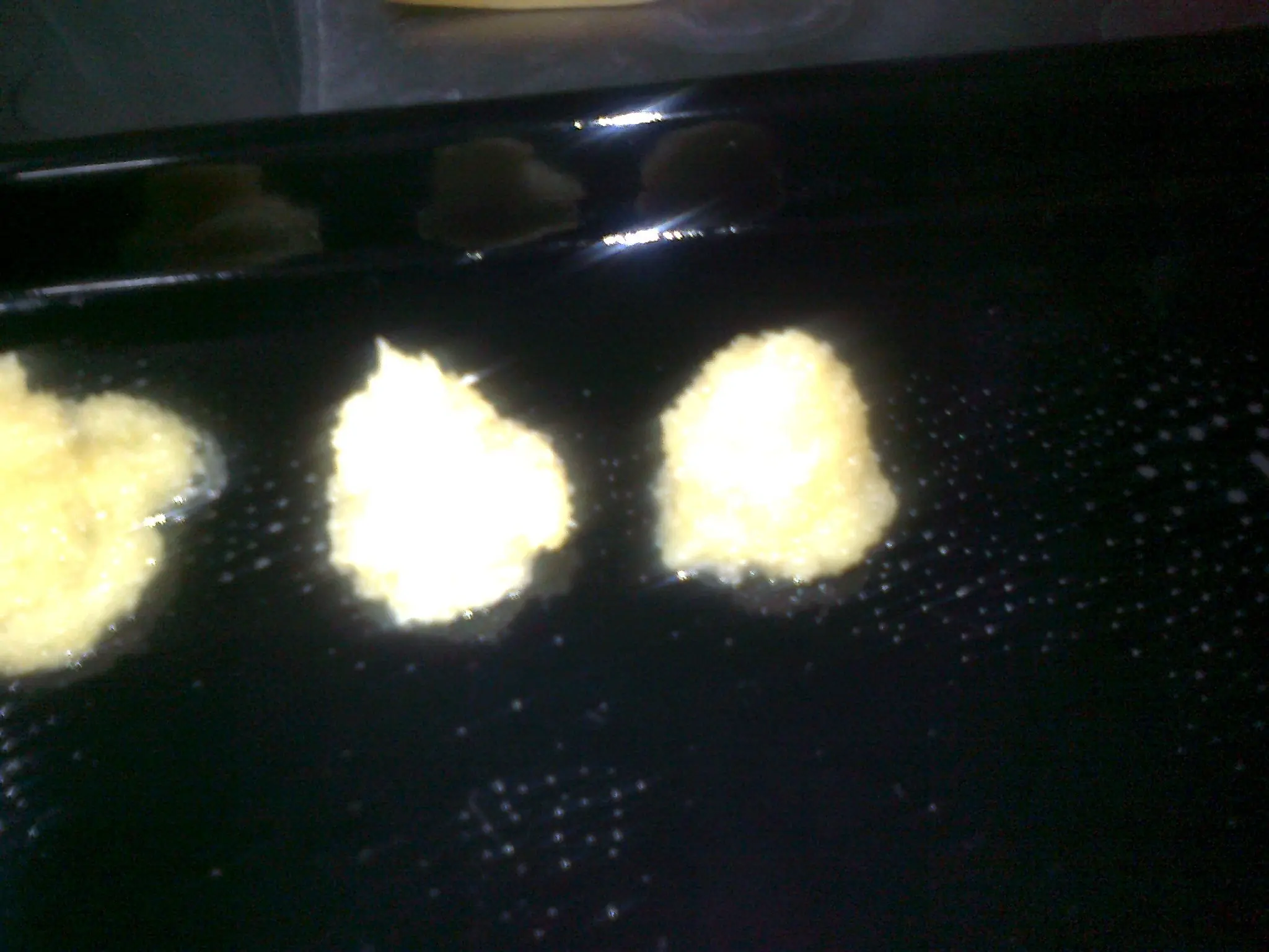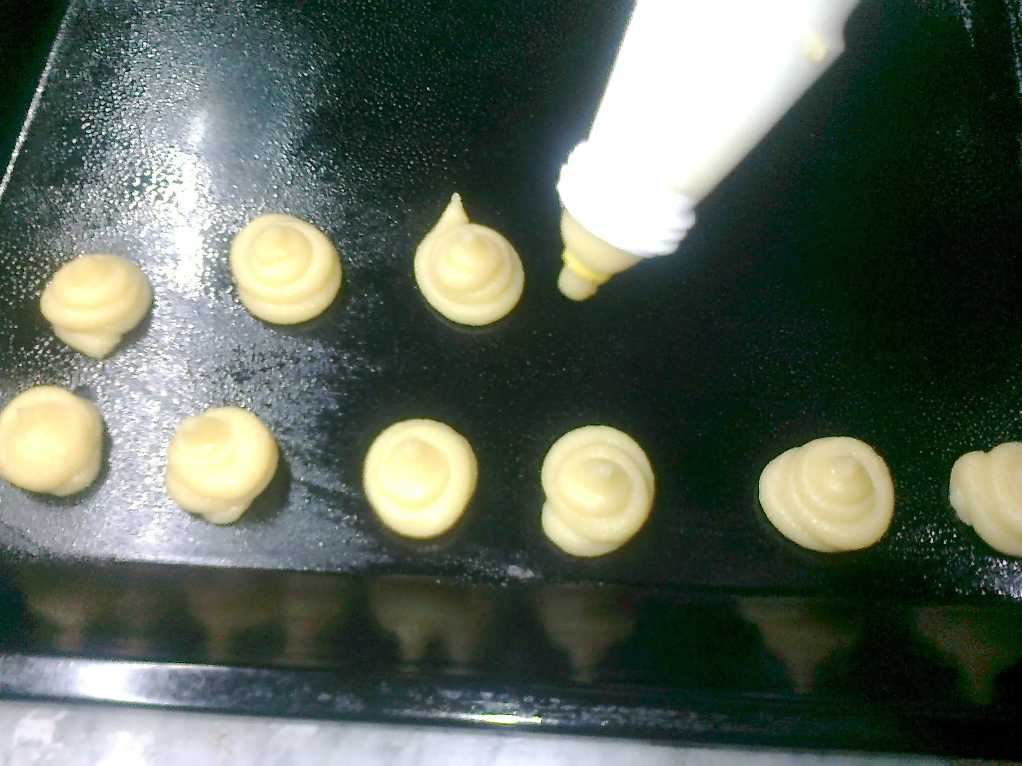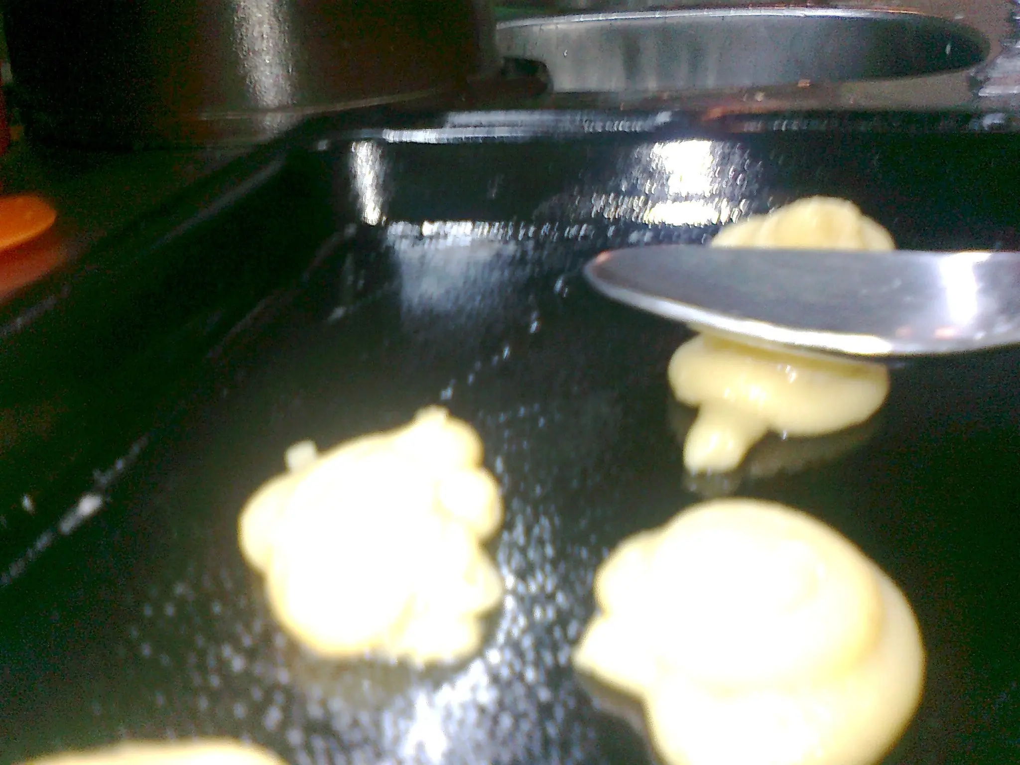 Despues mojá una cuchara para aplastar los picos de las bolitas que acabas de hacer con la manga