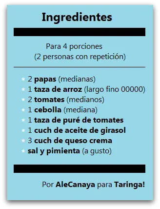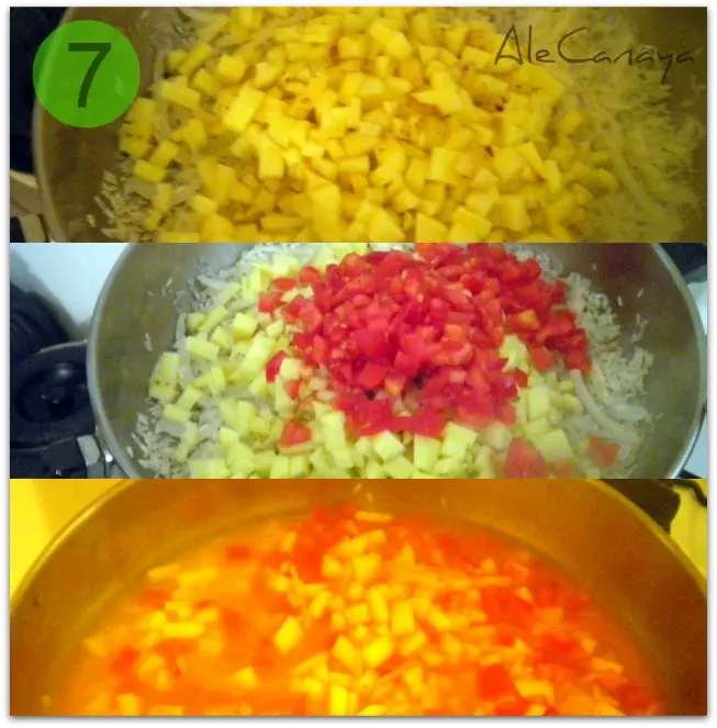 De una le añadimos las papas (patatas) chiquititas, el tomate cubeteado y dos tazas de agua hirviendo (a esta altura la pava ya burbujeaba de lo lindo). Revolvemos, tapamos y dejamos que cocine por un rato. No lo calculé con reloj (nunca lo hago), pero hasta que reduzca el agua y el arroz empiece a chupar. (Ah, me olvidaba... salpimenten sino le va a quedar medio desabrido todo o pónganle algún saborizante o especia que tengan a mano.)
