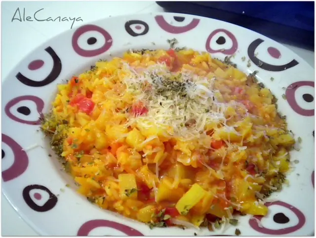Una taza de puré de tomates y tres cucharadas de queso crema (estoy como Martiniano Molina y le pongo Casancrem hasta a las medialunas). Revolvemos y dejamos un cachito más. Si quieren, vayan probando hasta que el arroz quede tierno. No tengan miedo y metan la cuchara (y si todavía le falto un poco y se va a acabando el líquido, agreguenle de a media taza agua hirviendo -o del líquido caliente que hayan elegido-).