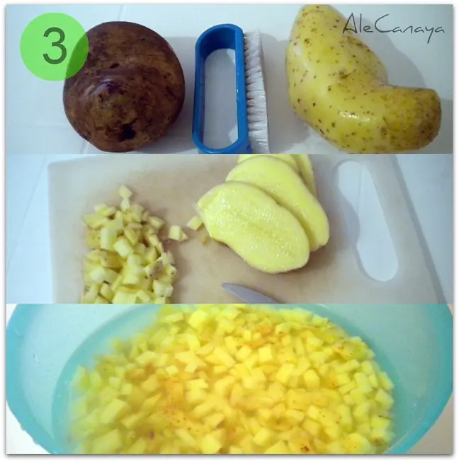 Las lavamos y con un cepillito le sacamos toda la tierra. Con un cuchillo le pueden sacar los ojos y grietas que tengan, pero traten de dejarle la cáscara que es lo más rico en nutrientes (y en sabor también). Aunque si les causa impresión, pueden pelarlas y dejarlas blanquitas como para puré. Cortamos en cubitos bien chiquititititos y las dejamos en agua fría hasta que sea el momento de usarlas.