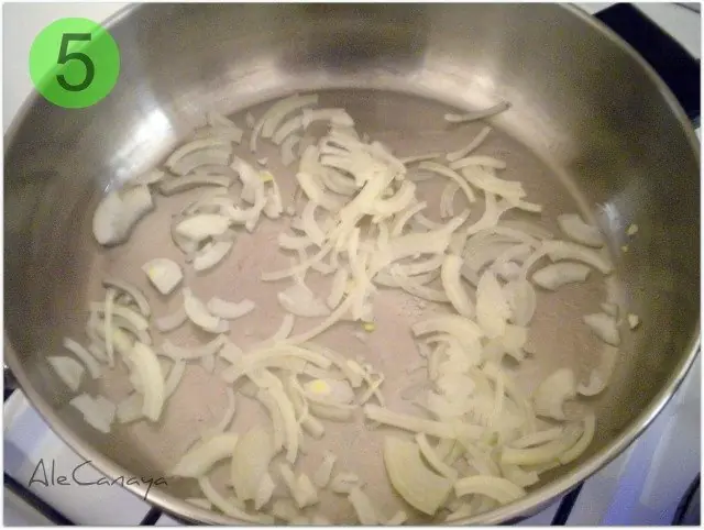 Ponemos a rehogar la cebolla. Haciendo los mandados más seguido le hubiera puesto, para aromatizar, una o varias de las siguientes opciones: un diente de ajo, un puerro, cebolla de verdeo o ciboulette. (Ya empieza a oler bien y las babas se me caen.)