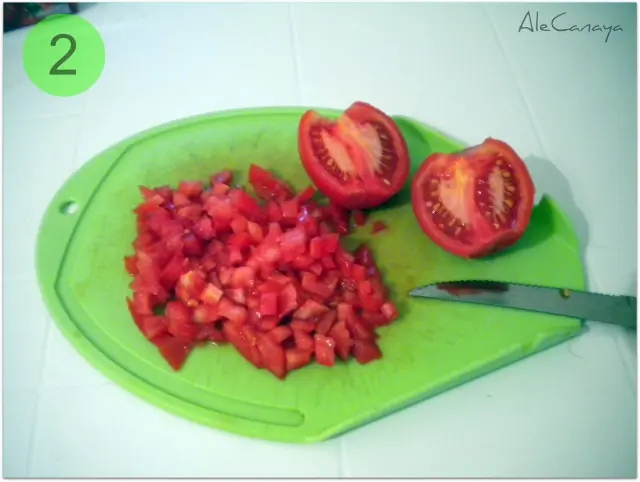 Cubeteo los tomates. Si quieren se le pueden sacar la piel (tajitos en cruz en los extremos, los ponemos medio minuto en agua hirviendo, luego los pasamos a un recipiente con agua fría y quedan listos para pelar al toque) y despepitarlo. Yo tenía hambre así que los corte asi como venían.