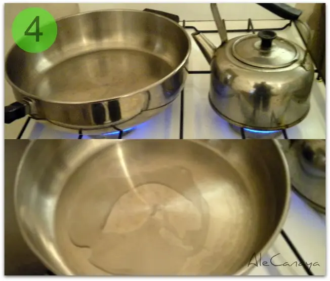 Fourth step, sartén y pava (o cualquier recipiente para calentar agua):