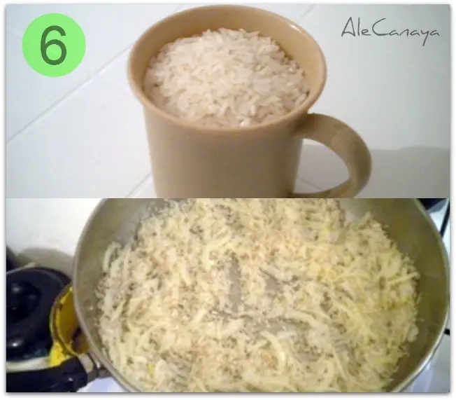 Media taza por persona. Somos dos, así que una taza (200 cm3). Lo agregamos a la sartén y dejamos que el arroz transparente un poco (solo un poquitín).
